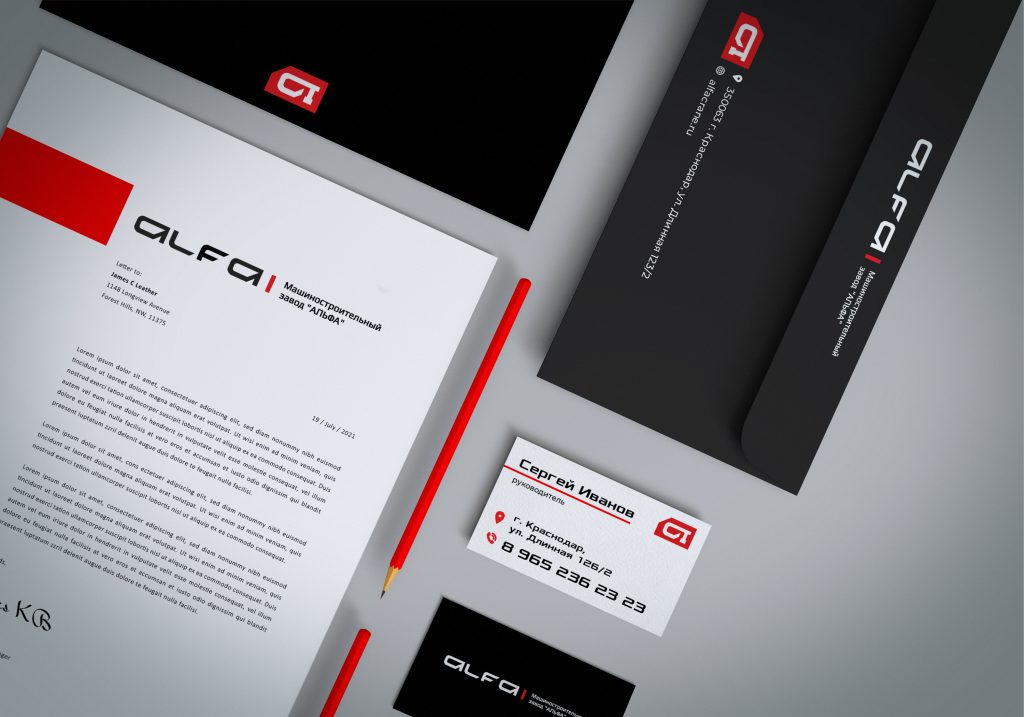 Работа началась с разработки логотипа — лаконичного, монолитного, с индустриальным характером. В основе — символика устойчивости и подъёма, передающая суть деятельности ALFA. Цветовая гамма выстроена вокруг глубокого черного и энергичного красного акцента, подчеркивающего динамику и технологичность.